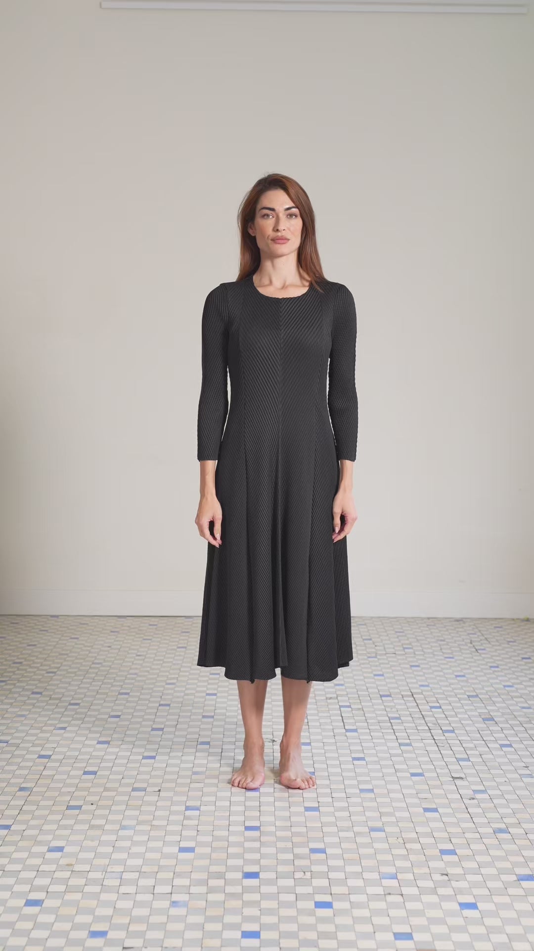 Aria is a streamlined midi dress designed for women who prefer understated elegance. The honeycomb pleating, clean lines, soft drape, and effortless fit make it a wardrobe staple that transitions seamlessly from day to evening.